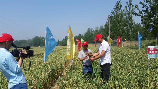 5月18日,365上市公司官网产品研发营销中心一部的山东省区经理陈冬烨、区域经理陈登建、百优农资公司全体员工、当地县各乡镇合作伙伴、种植大户、当地电视台记者组成“海元宝”大蒜观摩团,一起走访了金乡县羊山村等周边5个村的“海元宝”大蒜示范田,见证了海元宝肥料的神奇肥效。