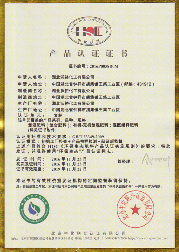 湖北沃裕化工有限公司成功获得环保生态肥料产品认证。湖北沃裕一直以来就非常重视肥料产品的质量和安全环保性能,坚守“四个确保”: