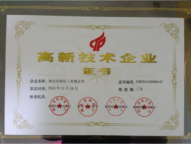 经湖北省科技厅、湖北省财政厅、湖北省国税局、湖北省地税局组织专家评审,湖北沃裕化工有限公司(以下简称“湖北沃裕”)最终获评“高新技术企业”,该项荣誉的获得为湖北沃裕的发展注入了新的活力。