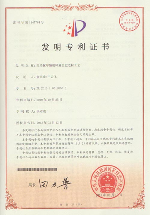 日前,湖北沃裕化工有限公司(以下简称“湖北沃裕”)自主开发的“高塔脲甲醛缓释复合肥造粒工艺”技术通过国家知识产权局专利审核,并被授予国家发明专利证书。据了解,该工艺技术代表着当前国内高塔复合肥技术发展的最高水平。