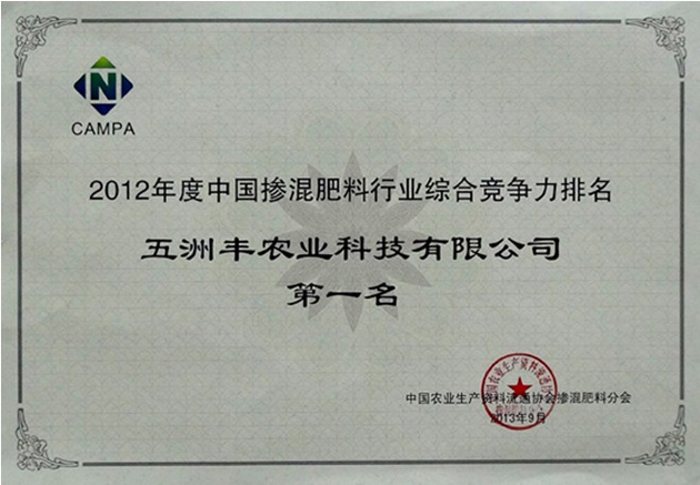 近日,由中华合作时报社-中国农资传媒、中国农业生产资料流通协会掺混肥料分会、国家化肥质量监督检验中心(上海)联合主办的“第七届中国BB肥行业发展高层论坛暨全国测土配方施肥典型经验技术研讨会”于北京落下帷幕。在本届研讨会上举办的“2013年度中国掺混肥料行业综合竞争力排名”中,五洲丰农业科技有限公司(以下简称“五洲丰”)荣登榜首。 中国BB肥行业发展论坛已成功举办六届,在推进BB 肥产业进步、BB 肥行业标准出台、BB 肥行业分会的成立等方面发挥了重要的作用。五洲丰作为BB国家标准起草单位,始终坚持推动BB肥行业创新和产品升级,致力于促进行业快速规范发展。目前,五洲丰已成功推出“蓝色海洋经典”第三代BB肥产品。